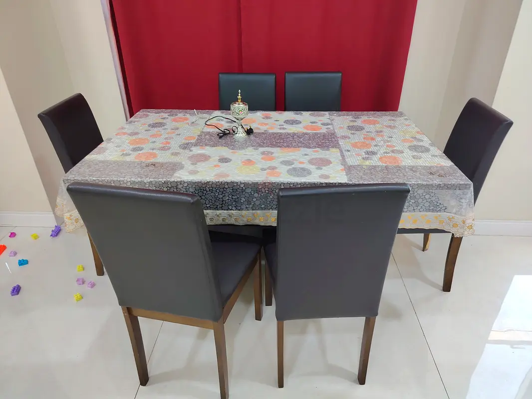 I am selling a modern dining table set that is perfect for family gatherings or dinner parties. This set includes a spacious rectangular dining table and six elegant chairs, all featuring a brown finish that adds a touch of warmth to your dining area. The table has been used normally over the past 1-2 years and remains in good condition, showing only minor signs of wear. Its generous seating capacity makes it ideal for hosting guests.