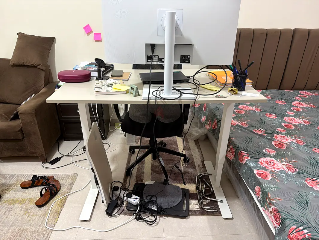 I'm selling a modern standing desk that really fits well with any workspace. It has a clean, white finish and is in good condition, perfect for anyone looking to add a stylish touch to their home office. The desk has a rectangular shape, providing ample surface area for your computer, paperwork, and other essentials. I’ve maintained it with normal usage, so it still looks great.