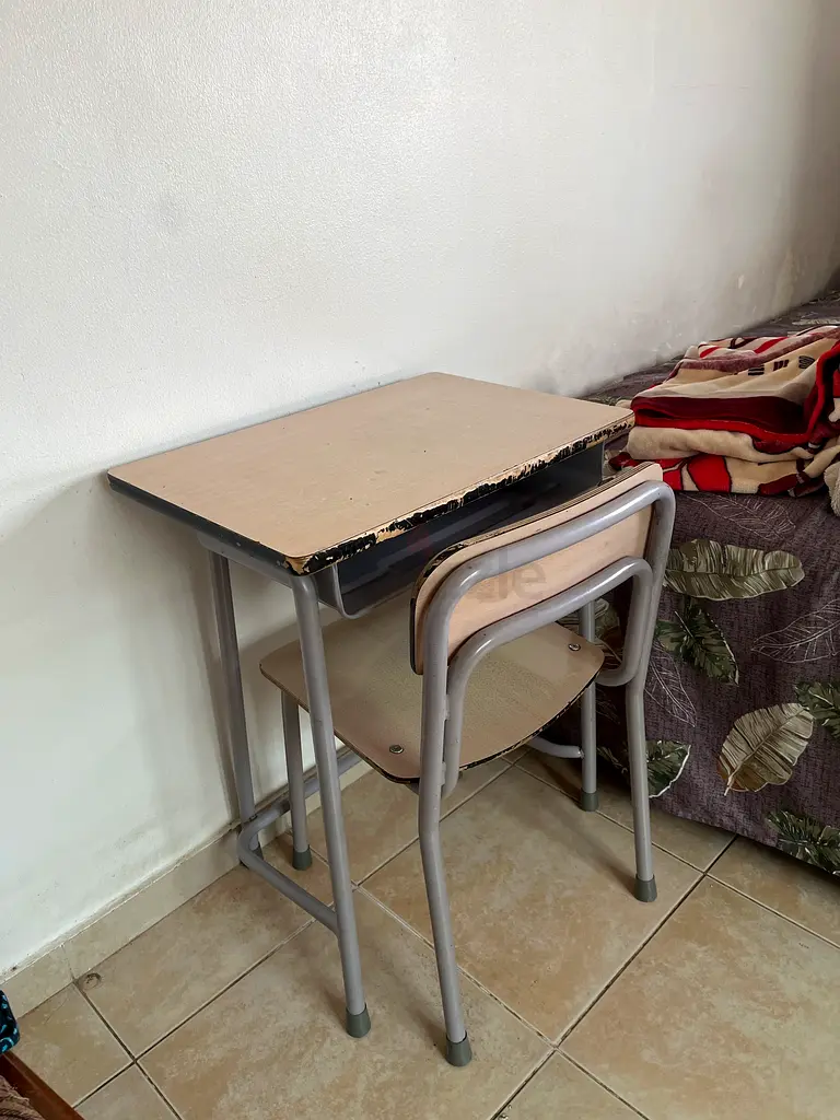 Selling a student study desk with an attached chair, suitable for kids aged 6-12 months. The desk has a rectangular shape and is designed for normal usage. While it shows some wear and tear, it's still functional and can serve as a great space for your child to study or do homework.