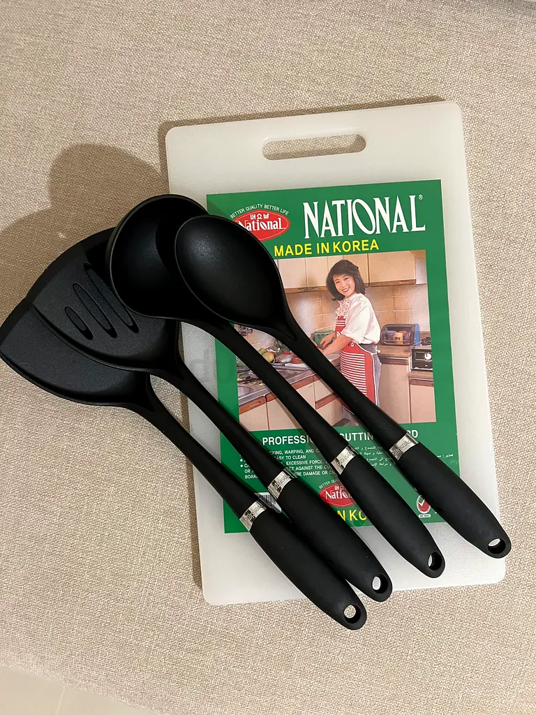 A brand new National cutting board and Prestige Kitchen Utensils Set. This set features high-quality utensils that are perfect for any kitchen task. The utensils are in flawless condition. Ideal for cooking and serving, this set includes various types of kitchen tools to make your culinary experience easier and more enjoyable.