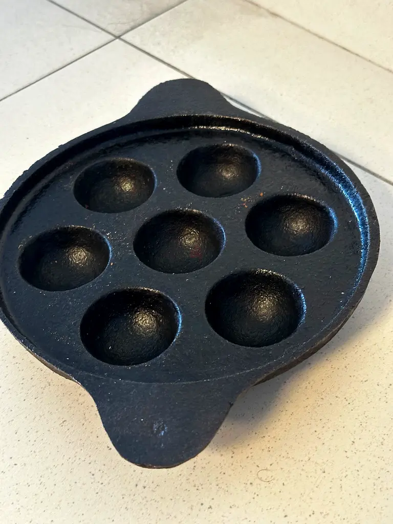 I'm selling my cast iron 7-hole aebleskiver / appe pan. I've had it for about 1-2 years and it’s in good condition with only light use. The pan is black cast iron, solid and heavy, and shows normal signs of use but no major damage. Cleaned and ready to use.
