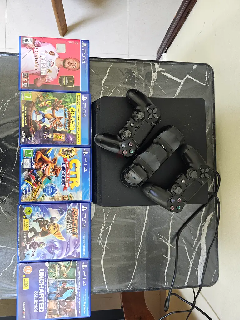 A playstation 4 slim, with 2 controller and a charger, bought with 5 games: fifa 20, crash bandicoot( 3 chapters) and CTR nitro fueled( racing game), ratchet and clank 1 ,and uncharted with part 1,2, and 3. Can be negotiated