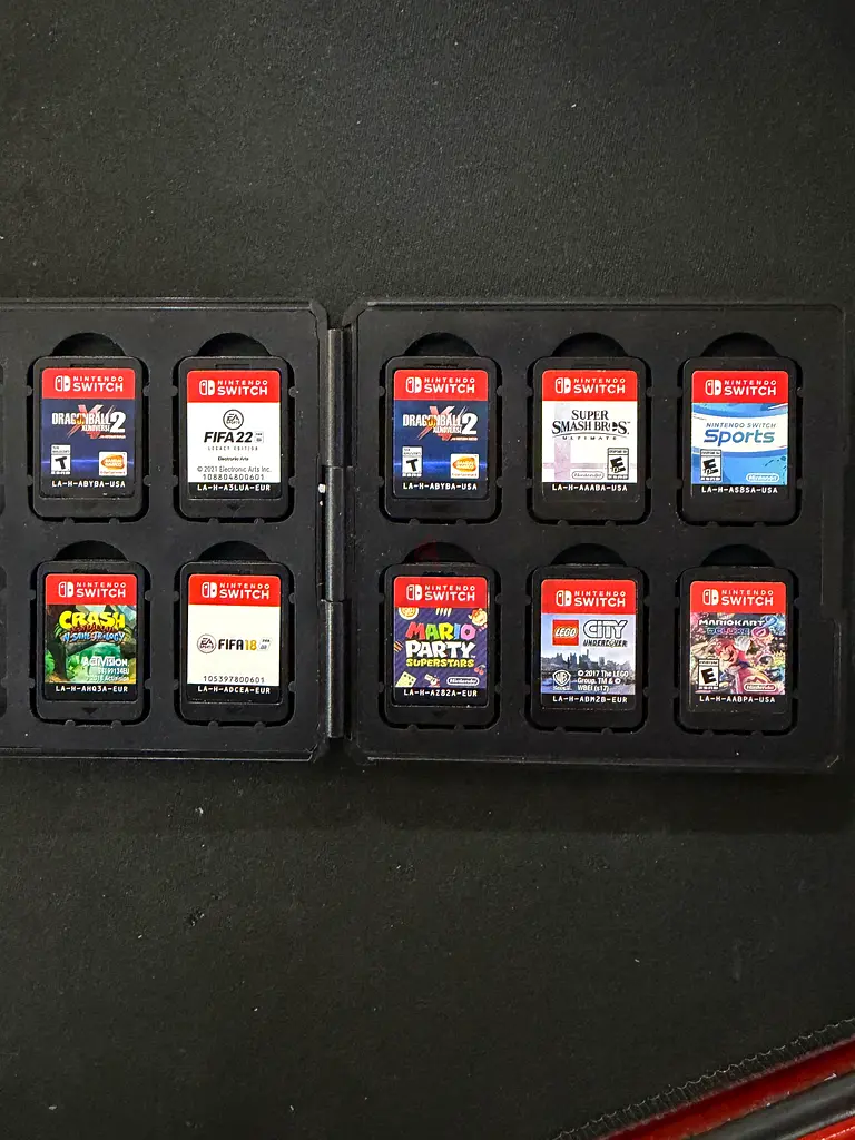 each game 90 to 100dj…'m selling a bundle of Nintendo Switch game cartridges kept in a protective storage case. I bought these about 1–6 months ago and they've had only light use. Condition is flawless — all cartridges power up and labels are intact. The set includes 12 cartridges and the travel case, and the games are rated E for Everyone covering Platformer, Sports, Action/Adventure and Racing genres. Compatible with Nintendo Switch.