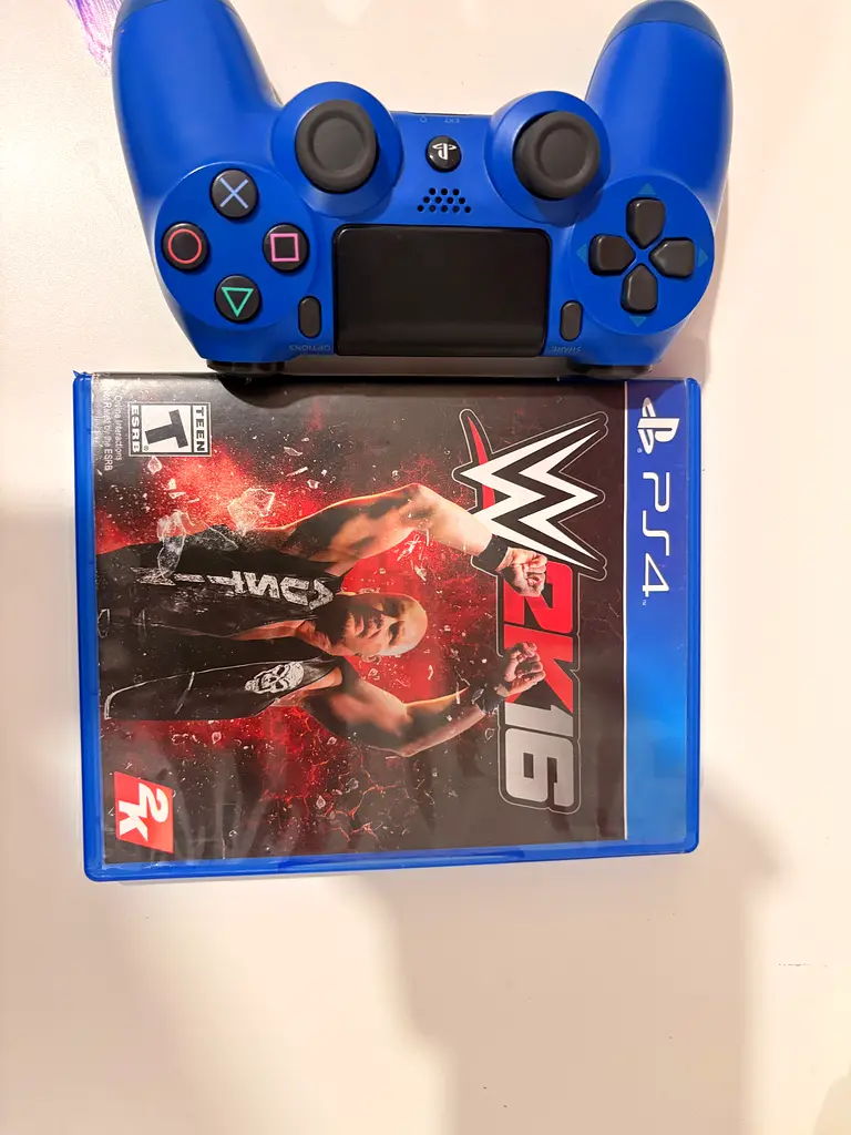I'm selling my blue PS4 DualShock controller together with the WWE 2K16 game for PS4. Both have been used for about 2–5 years but are in good condition and work fine. The controller has normal signs of use on the grips and buttons but no major damage, sticks are responsive and the touchpad and triggers function normally. The WWE 2K16 case and disc are included; the disc plays without issues and the cover art is intact. Rating for the game is T/Teen and the genre is sports/action-adventure.