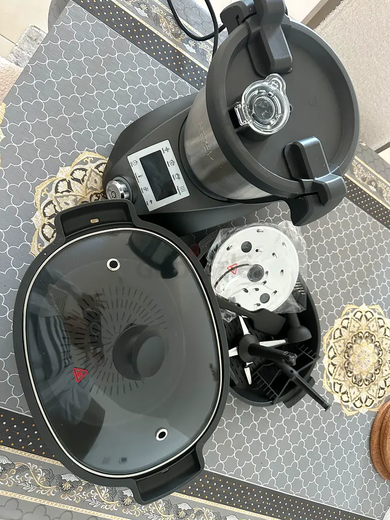 Multifunctional food processor for chopping, cooking, and preparing a variety of dishes. Quiet operation.