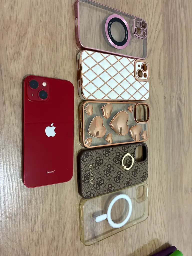 iPhone 13 (Red) with 5 Designer Cases - Good Condition