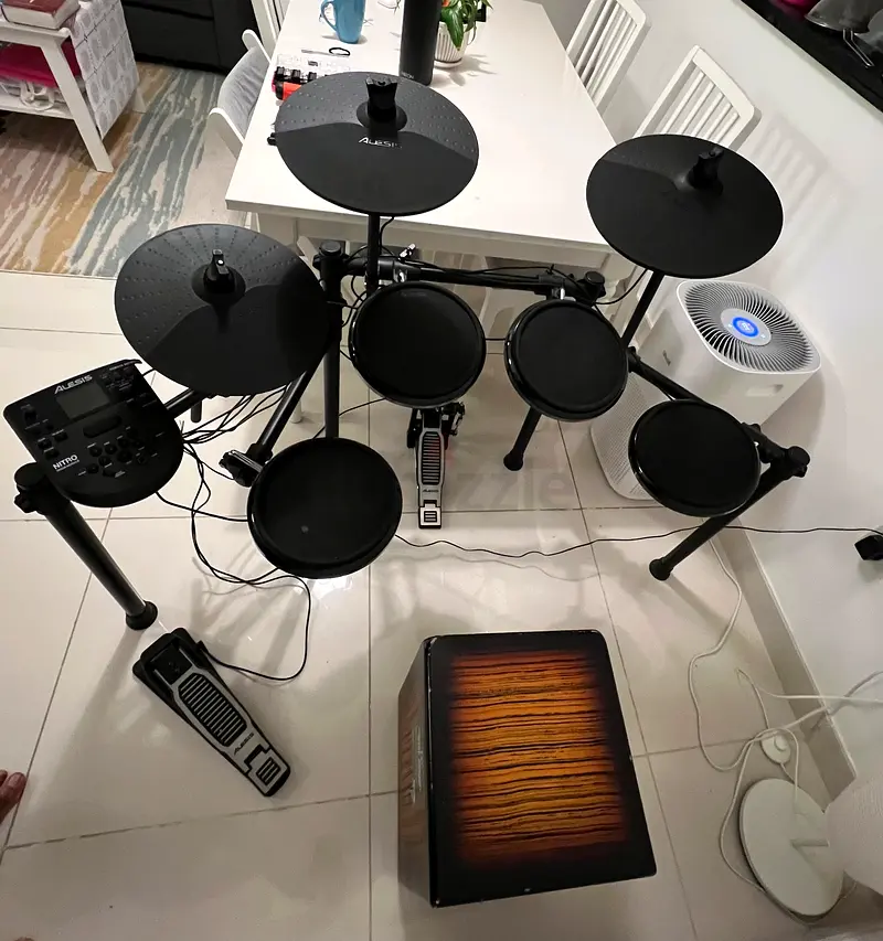 I’m selling my Alesis electronic drum kit that I’ve had for about 1–2 years. It’s in good condition and works normally — all pads, cymbals and the module power up and respond as expected. I used it at home for practice, so there are minor signs of regular use but no damage that affects performance. The set includes the drum module, snare and tom pads, hi-hat, crash and ride cymbals, kick pedal and cables. I’m also including a wooden cajon that I have been using alongside the kit. Everything is tested and ready to play; it’s a complete set for someone looking to practice or gig in small settings.