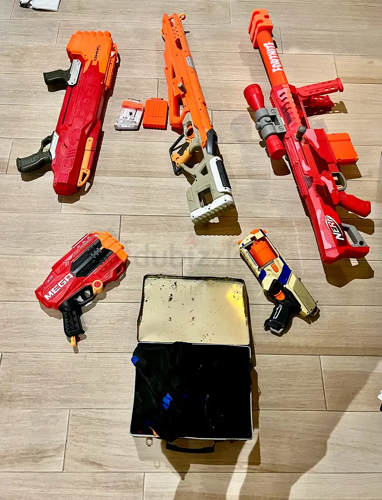 Various nerf guns , all together 600, individually 150 each, the small white and orange is 50, we have some mega bullets but some of the mega bullets are damaged. Enough regular bullets.