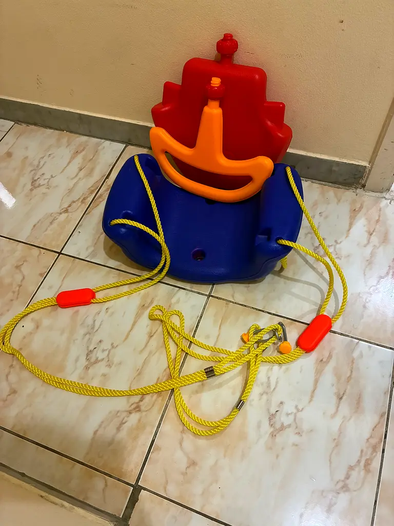 This is a colorful swing that is perfect for young children. It has a sturdy design with a safe seating area and durable ropes for secure attachment. The swing has been used only once and is in flawless condition, making it a great addition to your outdoor play setup. It's ideal for infants aged 0-1 month, providing a fun and safe way for them to enjoy the outdoors.
