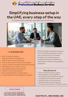 We are offering different kind of Services Details are mentioned below: -New Business setup -License Renewal -License Amendment -License cancellation -Audit Report -Adnoc Approvals -Haad Approvals -NOC -Partner visa process