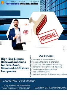 We are offering different kind of Services Details are mentioned below: -New Business setup -License Renewal -License Amendment -License cancellation -Audit Report -Adnoc Approvals -Haad Approvals -NOC -Partner visa process