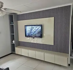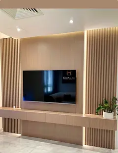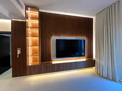 Temple cupboard • Kitchen Cabinets • Wooden Flooring. • TV media wall Unit.