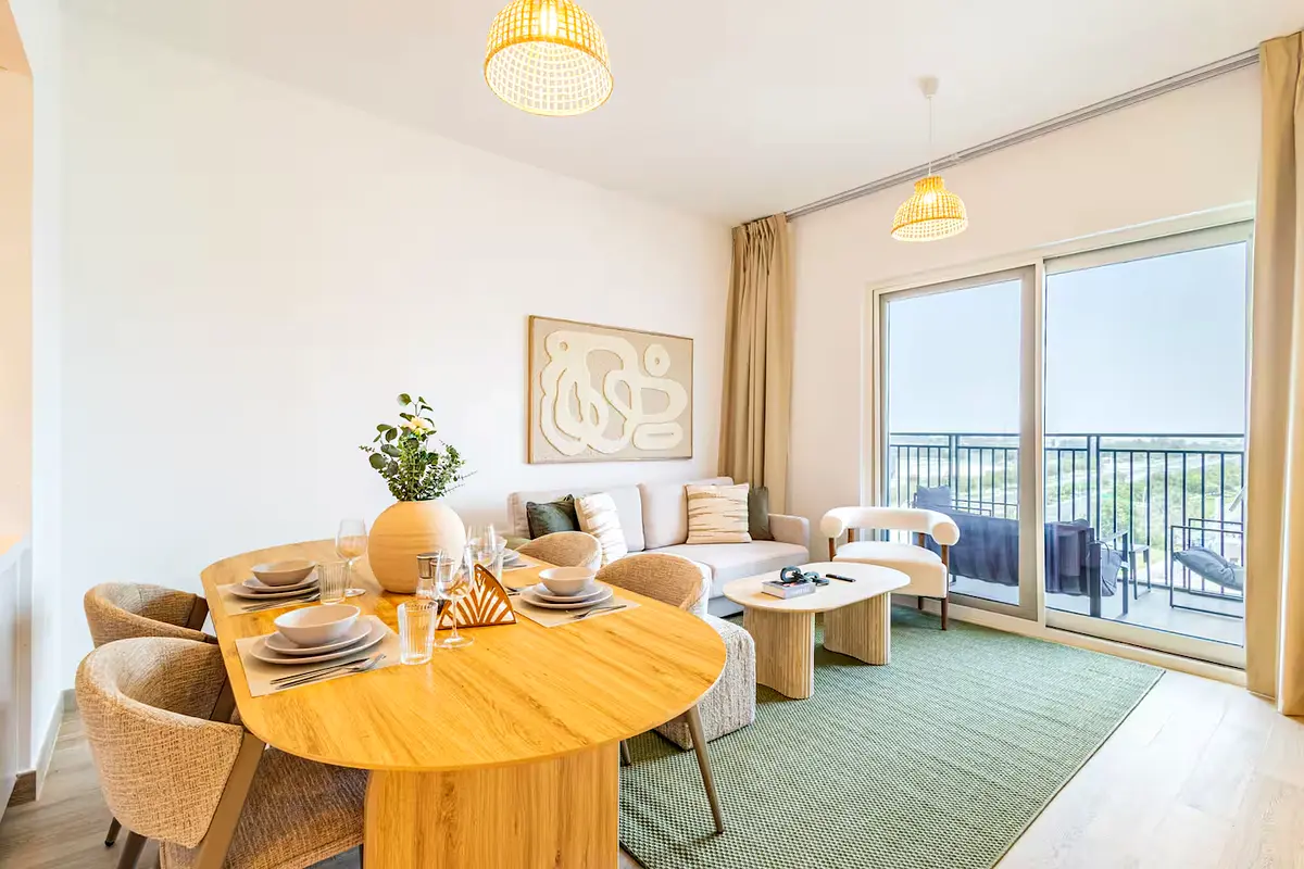 The open-plan layout includes a stylish dining space and modern kitchen for a seamless stay. Every detail is thoughtfully curated, blending comfort with designer flair. A full bathroom and extra washroom add ease for group travelers. Located minutes from Ferrari World, Yas Marina, SeaWorld, and more, adventure is right at your doorstep.